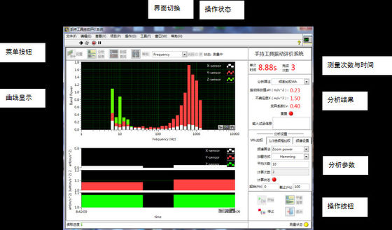 সিস্টেমটি হ্যান্ড-হোল্ড বৈদ্যুতিক সরঞ্জাম এবং হাতে ধরা পাওয়ার সরঞ্জামগুলির কম্পন স্তরের মূল্যায়ন করতে ব্যবহৃত হয়।কম্পন সংকেত হ্যান্ডেলে ইনস্টল করা কম্পন সেন্সর দ্বারা পরিমাপ করা হয়।সিস্টেমটি দুটি ধরণের বিশ্লেষণ পদ্ধতি গ্রহণ করে: মানব ম্যানুয়াল ভাইব্রেশন ফ্রিকোয়েন্সি মিটার WH পদ্ধতি ISO8041 এবং 1/3-অক্টেভ ফ্রিকোয়েন্সি রূপান্তরে নির্দিষ্ট করা হয়েছে।কম্পন নির্গমন মান, অনিশ্চয়তা এবং হ্যান্ডেলের ভিন্নতার সহগ পরিমাপ এবং বিশ্লেষণ করা যেতে পারে।